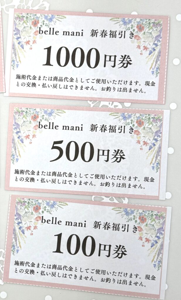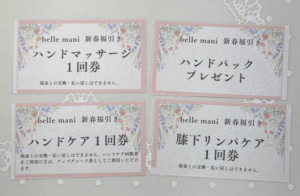 ちなみに今までのところ、ハンドケアチケット、ハンドマッサージチケット、500円券、100円券がそれぞれ複数出ておりますが、まだ1000円券とハンドパックと膝下リンパケアチケットは出てきていないです。