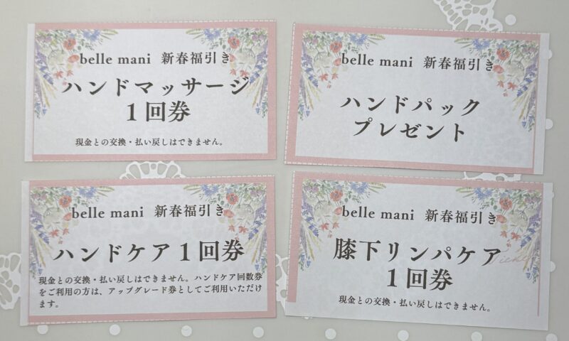 ちなみに今までのところ、ハンドケアチケット、ハンドマッサージチケット、500円券、100円券がそれぞれ複数出ておりますが、まだ1000円券とハンドパックと膝下リンパケアチケットは出てきていないです。